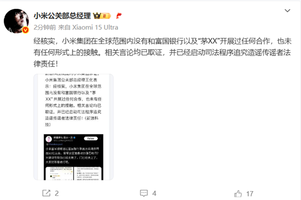 也未有任何形式上的接触。小米集团在全球范围内没有和富国银行以及“茅XX”开展过任何合作,小米集团公关部总经理王化表示:经核实,