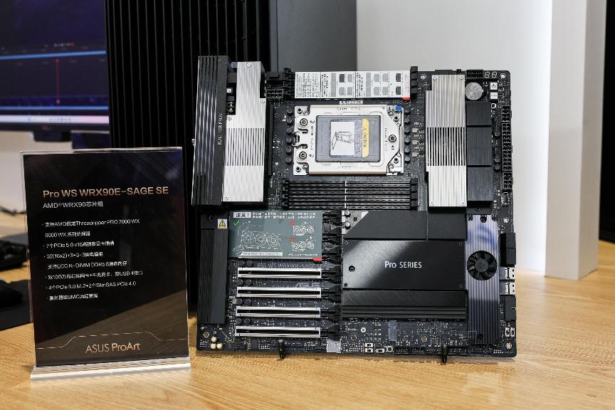 本次华硕ProArt展台特别展示了专为最新AMD锐龙ThreadripperPRO 7000 WX/9000 WX系列处理器打造的ProWS TRX50-SAGE WIFI A和ProWS WRX90E-SAGE SE工作站主板,还支持AI智能超频、提高生产效率。整体低调且奢华。